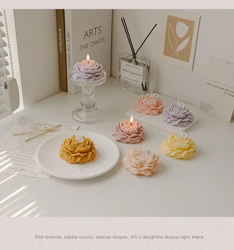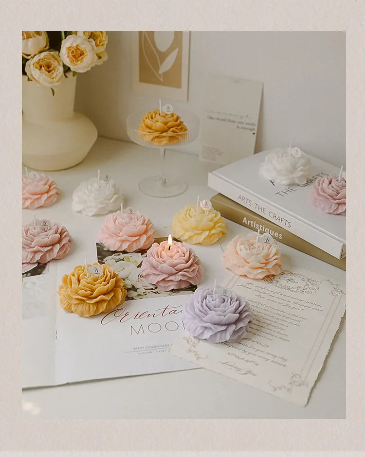 شمعة معطرة بتصميم زهرة الفاوانيا.